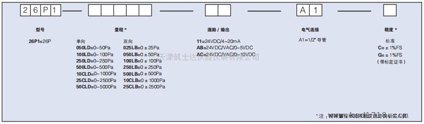 例:产品代码为,26P1050LD11A1C, 表示 26P 的量程为 050LD=0~50Pa, 输出为 4~20mA,1/2”导管口电器连接,精度为 1.0%,不带标定证书