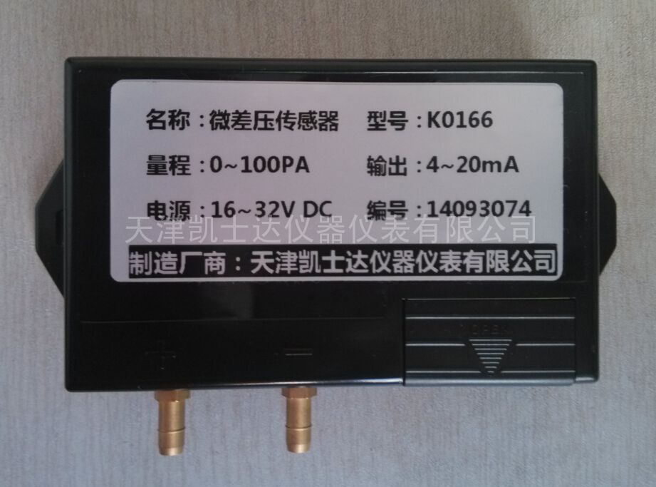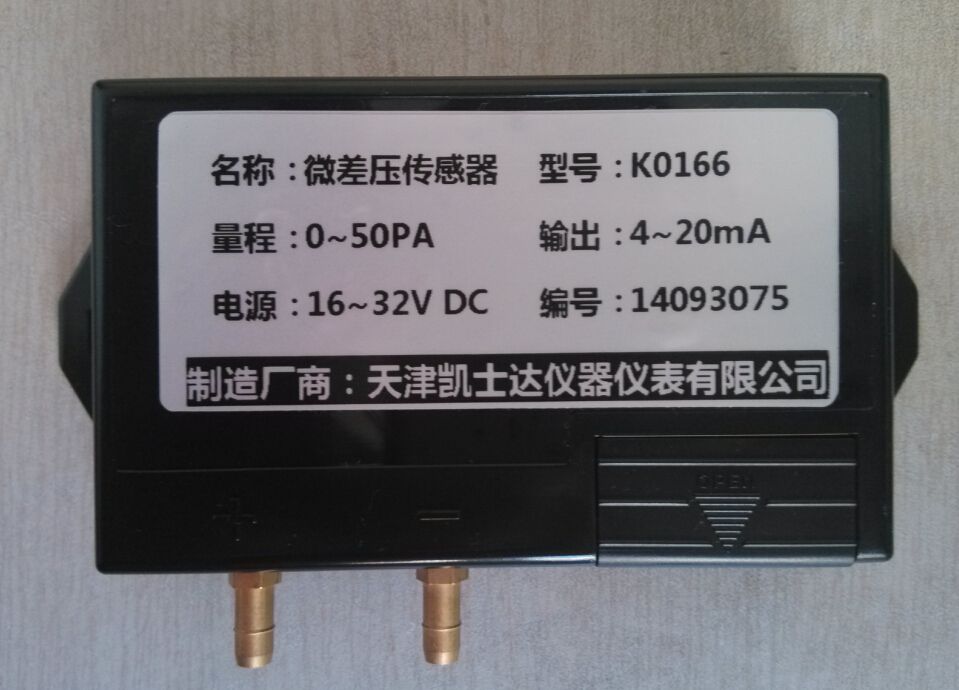 天津凯士达精品K0166房间压力传感器 0-50Pa 4-20mA 24VDC微压差压传感器,核心部件是一个电容式压力敏感元件,由不锈钢膜片与固定电极构成一个电容,其值随压力变化而变。可用来测量差压或表压,输出为0-5V,0-10V,4-20mA,也可以特制为其他输出。K0166 在室温下精度为±1.0%FS,0.4%FS 或0.25%FS.温度补偿范围在-5~+75℃,温度影响小于±0.05%FS/℃。广泛用于洁净室、净化车间、缓冲间、手术室、实验室、制药车间、生化试验区等洁净工程以及医疗仪器及设备,HVAC,暖通空调,窑炉,电厂风压监测,环境污染控制,烘箱增压及炉膛风压控制,天然气、煤气管网监测,井下通风领域。 技术参数